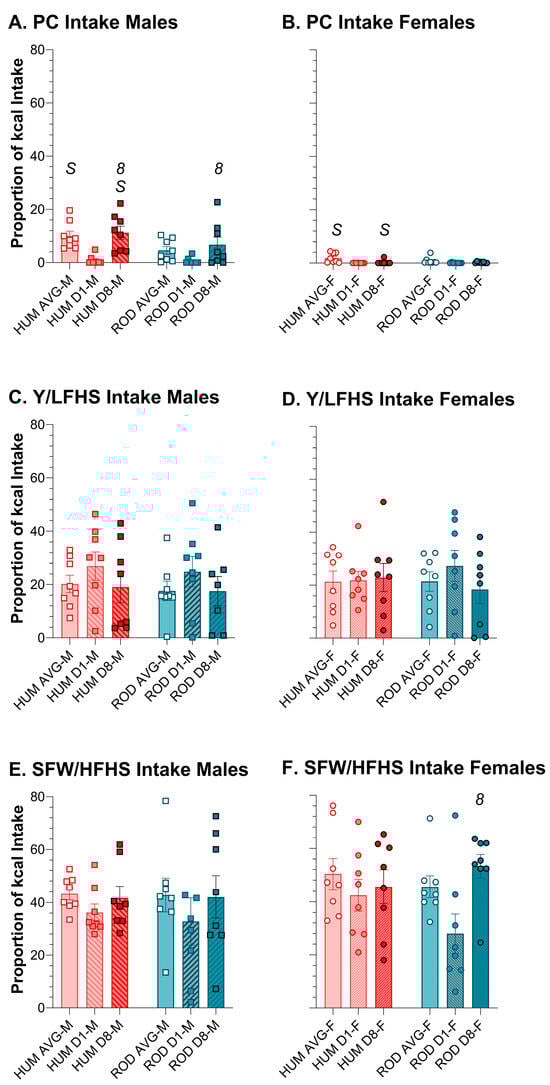 Average intake of the high-sugar choices and powdered chow was generally similar between the ROD (teal bars) and HUM (orange bars) diets for males (squares) and females (circles). Average intake and intake on Day 1 and Day 8 of each choice diet shown as a proportion of total kcal (MEAN ± SE). Nutritionally similar food choices between the HUM and ROD diets are shown side by side (nutritional details can be found in Table 1). ROD choices were high (H) or low (L) in fat (F) and/or sugar (S). PC = Powdered Chow; Y = Low-fat vanilla yogurt; SFW = Sugar–fat whip. Bonferroni-corrected statistical differences: 8 = day 8 vs. day 1; S = males vs. females. Statistical details are in Table 4 and Table 5. PC intake of (A) males and (B) females. Y/LFHS intake of (C) males and (D) females. SF/HFHS intake of (E) males and (F) females.