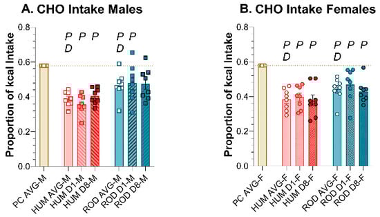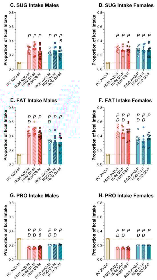 Compared to PC alone, male and female rats consumed less total CHO and PRO and more SUG and FAT on both the HUM and ROD diets (Figure 7, Table 6 and Table 7). Except for a slight decrease in sugar intake on the ROD diet and a slight increase in protein intake on the HUM diet across days in males, the macronutrient intake did not vary between Day 1 and Day 8 on either choice diet. In males and females, the sugar intake did not differ between the HUM diet and the ROD diet (Figure 7C,D, Table 6 and Table 7).