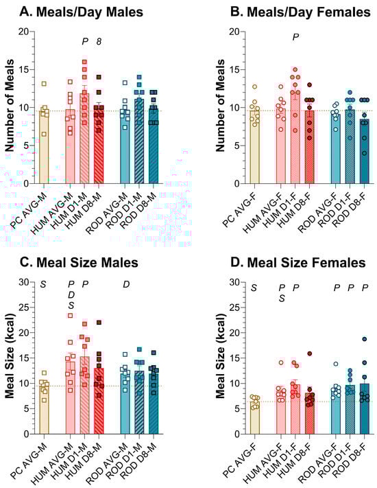 Effects on meal number and meal size were responsible for Day 1 increases in intake. Graphs show meal number and meal size as MEAN ± SE for the average during each diet phase (powdered chow (PC, tan bar), the human-foods diet array (HUM, orange bars), and the custom rodent diet array (ROD, teal bars) and on Day 1 and Day 8 of each choice diet. Individual animals are represented by squares (males) or circles (females). The tan dashed horizontal line represents the mean for PC. The letters/numbers above the bars denote Bonferroni-corrected statistical differences: P = ROD/HUM vs. PC average; D = ROD/HUM vs. each other; 8 = day 8 vs. day 1; S = males vs. females. Statistical details are in Table 8 and Table 9. Number of meals per day in (A) male rats and (B) female rats. Meal size of (C) male rats and (D) female rats.