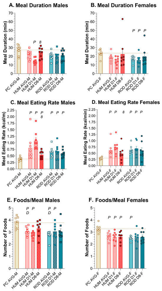 Meal duration, eating rate, and foods per meal. Graphs show meal duration, eating rate, and number of foods/meals as MEAN ± SE for the average during each diet phase (powdered chow (PC, tan bar), the human-foods diet array (HUM, orange bars), and the custom rodent diet array (ROD, teal bars) and on Day 1 and Day 8 of each choice diet. Individual animals are represented by squares (males) or circles (females). The tan dashed horizontal line represents the mean for PC. The letters/numbers above the bars denote Bonferroni-corrected statistical differences: P = ROD/HUM vs. PC average; D = ROD/HUM vs. each other; 8 = day 8 vs. day 1. Statistical details are in Table 9 and Table 10. Meal duration of (A) male and (B) female rats. Meal eating rate of (C) male and (D) female rats. Number of foods/meal of (E) Male and (F) Female rats. For panels (E,F), the tan bar and tan dashed line represent the mean number of jars of PC engaged.