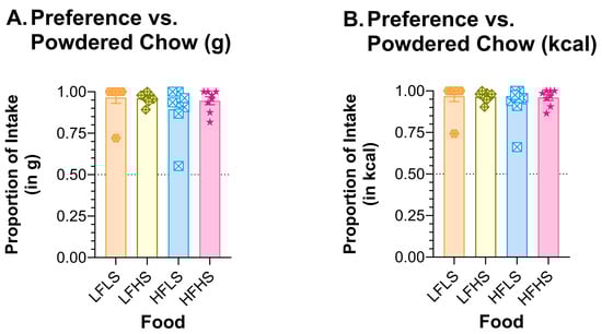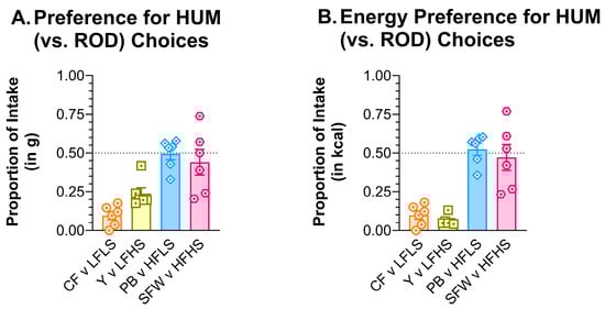 Rats preferred the ROD choices that were low in fat over the low-fat HUM foods. Graph shows MEAN ± SE proportion of (A) grams or (B) the proportion of total kcal eaten from each HUM food choice when offered with only the nutritionally similar ROD option as the other food choice. The dashed line at 0.50 shows the point of equal preference; values above this line indicate greater preference while values below the line denote less preference. The bar colors match the food jar labels in Figure 1C. Individual rat preferences are shown as symbols in each bar. CF = chickpea flour; Y = low-fat vanilla yogurt; PB = creamy peanut butter; SFW = sugar–fat whip; ROD choices were high (H) or low (L) in fat (F) and/or sugar (S).