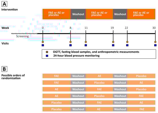Study design. (A) Each intervention had a duration of eight weeks. Intervention periods were separated by washout periods with a duration of three weeks, resulting in a total study duration of 30 weeks. Before and after each intervention period, 24 h blood pressure and fasting blood samples were taken, which is marked with orange dots. (B) The order of the interventions was random with six possible orders.