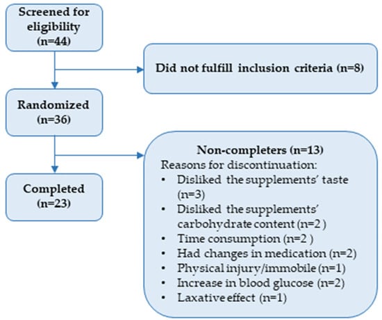 As depicted in Figure 2, we assessed 44 participants for eligibility, and we included 36 participants of whom 23 completed the study. We have previously reported the baseline values (see Table 2) [23]. Of the completers of the trial, 15 were men and 8 were women; the mean body mass index was 82.0 ± 16.2 kg/m2 and the mean age was 67.6 ± 5.5 years [23]. Of the non-completers, 21 were men and 15 were women; the mean body mass index was 28.6 (24.3–32.0) kg/m2 and the mean age was 66.9 ± 6.0 years. The participants continued with their regular medications during the course of the trial (see Table 3).