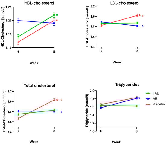 Regarding lipids, the intra-group analysis revealed several increases distributed across all groups after supplementation, and an overview is provided in Figure 3. Firstly, HDL-cholesterol was increased from 1.14 ± 0.05 to 1.22 ± 0.05 mmol/L (p = 0.03) after supplementation with FAE. Secondly, triglycerides were increased from 1.58 ± 0.13 to 1.81 ± 0.13 mmol/L (p = 0.03) after supplementation with AE. Lastly, HDL-cholesterol was increased from 1.12 ± 0.05 to 1.20 ± 0.05 mmol/L (p = 0.02), LDL-cholesterol was increased from 1.82 ± 0.11 to 2.02 ± 0.12 mmol/L (p = 0.01), and total cholesterol was increased from 3.67 ± 0.13 to 4.03 ± 0.14 mmol/L (p = 0.0003) in the placebo group. Regarding inter-group differences, ΔLDL-cholesterol and Δtotal-cholesterol were significantly higher in the placebo group compared to the AE group. Specifically, ΔLDL-cholesterol was −0.09 ± 0.07 mmol/L in the AE group and 0.20 ± 0.08 mmol/L in the placebo group (p = 0.04), and Δtotal-cholesterol was 0.002 ± 0.08 mmol/L in the AE group versus 0.36 ± 0.09 mmol/L in the placebo group (p = 0.01). However, it should be noted that differences within groups were small with changes of maximum 0.1 mmol/L after supplementation with AE and FAE, except for triglycerides, which increased by 0.23 ± 0.08 mmol/L in the AE group. Increases were higher after supplementation with placebo, with increases in triglyceride and LDL-cholesterol of 0.2 mmol/L and in total cholesterol of 0.4 mmol/L.