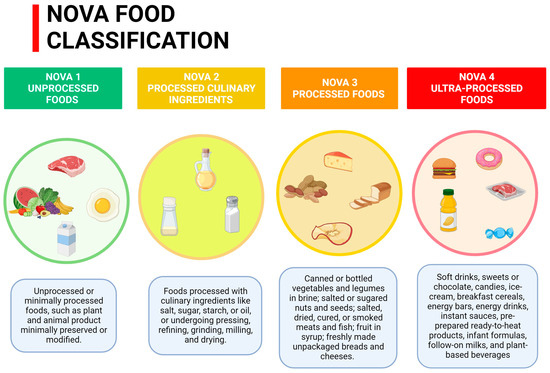 UPFs, according to the NOVA food classification system (Figure 1), are readily available meals that are often used as a practical substitute for traditional ones [12,13,14]. They are characterized by higher concentrations of sugars, SFAs, and sodium [15]. Moreover, these processed foods are energy dense, highly palatable, and impact the glycemic load. They are also lower in protein, dietary fiber, micronutrients, and phytochemicals, compared to their counterparts [16].