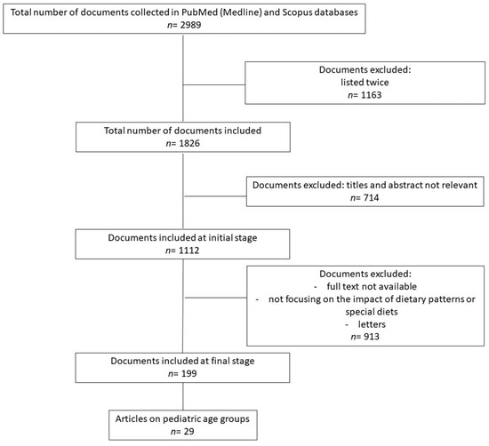 Documents were excluded at different steps: when listed twice (n = 1163), or when their titles and abstract were not relevant (n = 714). Although numerous studies collected (n = 1112) had a connection between inflammation and pediatric diseases, the authors chose to focus the review only on papers regarding the impact of dietary patterns, special diets, specific foods, or nutrients, on the onset or progression of the disease. The most relevant studies, including original papers, meta-analyses, clinical trials, and observational studies, were selected. Letters were excluded. Articles on the adult population were added and used to expand the discussion. A final number of 199 articles were selected, of which 29 were on pediatric age groups. Preclinical studies were considered only to complement descriptions of the pro-inflammatory diets’ mechanisms of action, thereby unifying the molecular basis with the randomized controlled trials’ (RCTs) evidence. Of the IEMs, only Phenylketonuria (PKU) and glycogen storage diseases (GSDs) were included, as enough publications ware available.