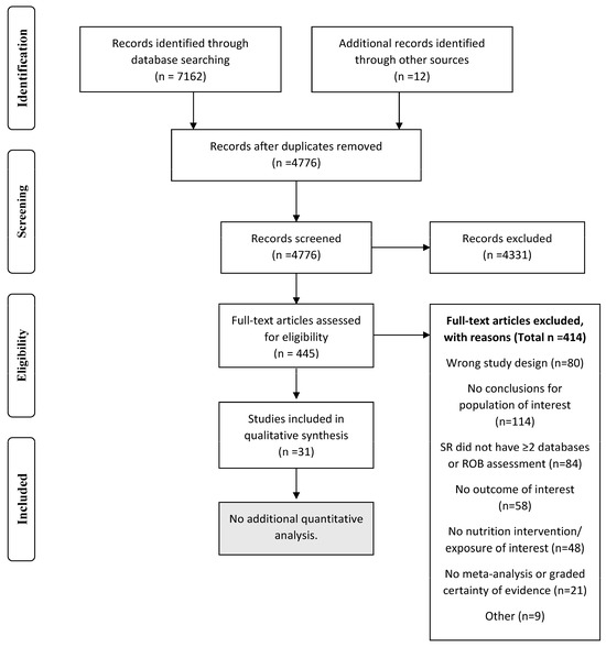 There were 4776 unique articles identified by the database searches, and authors reviewed the full text of 445 articles. A list of articles excluded during full-text review, including reasons for exclusion is available in Supplementary Table S6. Thirty-one SRs were included in this umbrella review [20,21,22,23,24,25,26,27,28,29,30,31,32,33,34,35,36,37,38,39,40,41,42,43,44,45,46,47,48,49,50]. SRs examined nutrition interventions for pediatric obesity prevention in all settings combined [20,22,30,33,34,43,44,47] or in the home and family [20,22,35], healthcare [22,37,49,50], school [20,22,23,25,27,28,29,36,38,40,41,42,46], or community settings [21,22], or examined the efficacy of food assistance programs [24,26,27,31,32,39] or electronic interventions [45,48]. The study selection process is described in Figure 1. Study characteristics are described in Table 2, and SR quality, as measured by the AMSTAR2 tool, can be found in Supplementary Table S7. Some SRs reported findings for more than one age group or settings category (Table 2).