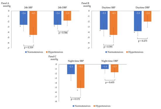 Changes from baseline ABP according to baseline blood pressure (normotensives vs. hypertensives). (A) 24 h systolic (SBP) and diastolic (DBP) blood pressure changes; (B) daytime systolic (SBP) and diastolic (DBP) blood pressure changes; and (C) night-time systolic (SBP) and diastolic (DBP) blood pressure changes; * p < 0.05 for comparison between baseline and follow-up BP within the single subgroup. The p-values shown refer to the p for interaction.