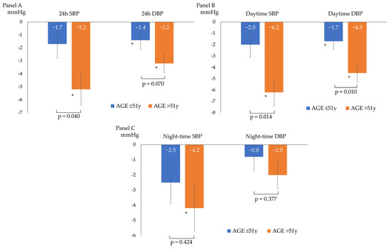 Changes from baseline ABP according to the median age of the study population: ≤ 51 years (n = 23 patients) or > 51 years (n = 20 patients). (A) 24 h systolic (SBP) and diastolic (DBP) blood pressure changes; (B) daytime systolic (SBP) and diastolic (DBP) blood pressure changes; (C) and night-time systolic (SBP) and diastolic (DBP) blood pressure changes; * p < 0.05 for comparison between baseline and follow-up BP within the single subgroup. The p-values shown refer to the p for interaction.