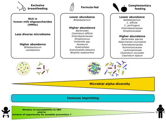 Composition of gut microbiota in early life in relation to child’s diet. Bifidobacterium predominates in exclusively breastfed infants, while, in formulae-fed infants, the composition is less uniform and notably enriched with Bacteroides, Streptococcus or Clostridium. The introduction of solid foods leads to a wider range of microorganisms with greater microbial α-diversity and abundance. The establishment of interactions between the host immunity and the microbiota may result in susceptibility to or protection against the onset of IBD later in life. It is relevant to consider the first months of life as a window of opportunity for preventive dietary intervention to promote early protective effects.