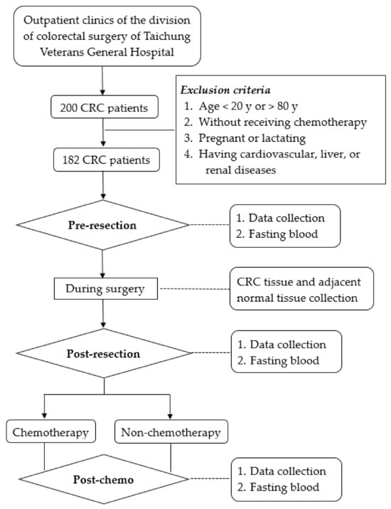 We recruited consecutive patients with colon or rectal cancer (International Classification of Diseases, Tenth Revision, Clinical Modification ICD-10-CM, codes C18–C20, respectively) and with tumor resected from the Colorectal Surgery Division of Taichung Veterans General Hospital, Taiwan. We excluded patients who were <20 or >80 years old, were pregnant or lactating, or had cardiovascular, liver, or kidney disease. Each patient signed an informed consent form prior to participation in the study.