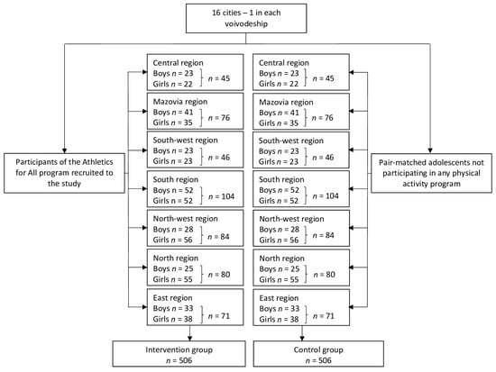 The intervention group was recruited from all the voivodeships in Poland (being the basic administrative unit in Poland), while for each voivodeship, a medium-sized city was chosen, and within this city, a typical training group within the Athletics for All program. Based on the data of the Central Statistical Office in Poland [], the proportion of children aged 10–14 in each voivodeship was taken into account, and the sample size for each voivodeship was settled to keep the national proportions.