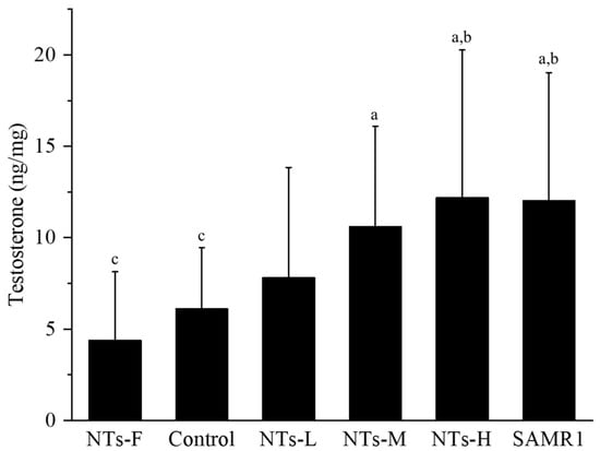 Effect of NTs on testosterone content in testicular tissue. We randomly chose 10 mice to be tested. a Compared with the NTs-F group (p < 0.05); b compared with the control group (p < 0.05); c compared with the SAMR1 group (p < 0.05). Among the three NT intervention groups: d compared with the NTs-L group (p < 0.05); e compared with the NTs-M group; f compared with the NTs-H group (p < 0.05).