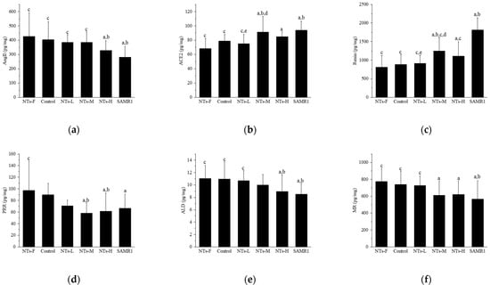 In Figure 3a, Ang II levels were higher in the NTs-F group than in the NTs-H and SAMR1 groups (p < 0.05), and were lower in the NTs-H and SAMR1 groups than the control group (p < 0.05); among the three intervention groups with different doses of NTs, no intergroup differences were observed (p > 0.05). In Figure 3b, the ACE2 level in the NTs-F group was lower than those in the NTs-M, NTs-H, and SAMR1 groups (p < 0.05), was higher in the NTs-M and SAMR1 groups, compared to the control group (p < 0.05), and, in the intervention group, it was significantly higher in the NTs-M group than in the NTs-L group (p < 0.05). In Figure 3c, the renin level in the NTs-F group was lower than those in the NTs-M, NTs-H, and SAMR1 groups (p < 0.05), and higher in the NTs-M and SAMR1 groups than the control group (p < 0.05). Within the NT intervention groups, the NTs-M group was significantly higher than the NTs-L group (p < 0.05). In Figure 3d, for PRR levels in testicular tissue, no difference was observed between the control and SAMR1 groups (p > 0.05), and there was also no difference observed between the NTs-F and control groups (p > 0.05). In Figure 3e, ALD levels were higher in the NTs-F group than in the NTs-H and SAMR1 groups (p < 0.05), and were lower in the NTs-H and SAMR1 groups than the control group (p < 0.05). No differences were observed among intervention groups (p > 0.05). In Figure 3f, MR levels were higher in the NTs-F group than in the NTs-M, NTs-H, and SAMR1 groups (p < 0.05), lower in the SAMR1 group, compared with the control group (p < 0.05), and no difference was observed in the intervention groups versus the control group (p > 0.05).