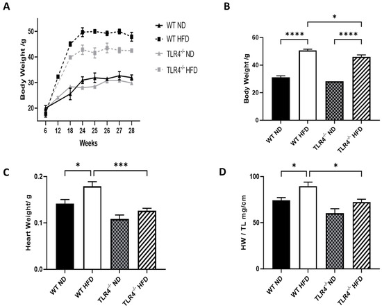 TLR4 deficiency attenuates high-fat diet-induced weight gain and cardiac hypertrophy. (A,B) Body weights in grams (g), (C) heart weights, and (D) heart weight/tibia length (HWTL) at the time of tissue harvest in TLR4−/− mice and WT controls I response to ND and HFD. n = 6 or 10. Statistical significances are denoted with asterisks as follows: * p < 0.05, *** p < 0.001, **** p < 0.0001.