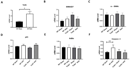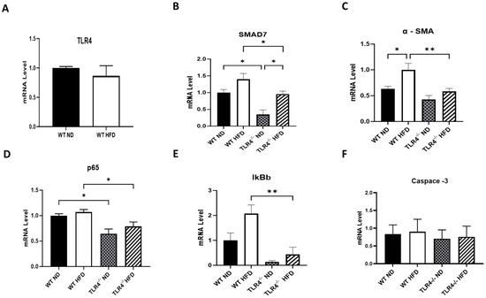 Effect of abdominal aortic constriction (AAC) on TLR4-dependent inflammatory cascade. Cardiac mRNA levels of (A) TLR4, (B) SMAD7, (C) α-SMA, (D) p65, (E) IkBb, and (F) caspase-3 in TLR4−/− mice and WT controls after 12 weeks exposure to either ND or HFD. n = 4–6. Statistical significances are denoted with asterisks as follows: * p < 0.05, ** p < 0.01.