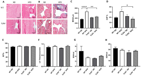 Using immunohistochemistry to evaluate the effect of high-fat diet on cardiac microanatomy, we found that the myocyte cross-sectional area (MCSA) and collagen volume fraction (CVF) were notably lower in TLR4−/− mice compared to their WT controls on HFD but not on ND (Figure 3A–D). The hemodynamic cardiac function was assessed using 2D echocardiography, which revealed that neither TLR4 deficiency nor HFD interventions had any impact on ejection fraction (EF), left ventricular (LV) thickness, end-systolic volume (ESV), or end-diastolic volume (EDV) (Figure 3E–H). These findings suggest that “TLR4 deficiency” offers protection to cardiac tissue by reducing fibrosis and inflammatory response in mice but does not confer any observable physiological benefits in the absence of additional injuries or stressors.