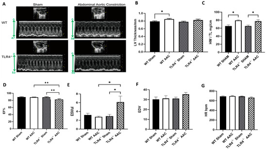 TLR4 deficient mice are protected from cardiac hypertrophy induced by AAC. (A) Representative echocardiography images 60 days after operation, (B) left ventricle (LV) thickness, (C) quantitative analysis of heart weight/tibia length (mg/cm) 84 days post-intervention, (D) ejection fraction (EF), (E) end-systolic volume (ESV), (F) end-diastolic volume (EDV), and (G) heart rate (HR) in TLR4−/− mice and WT controls in response to AAC. n = 6–10. Statistical significances are denoted with asterisks as follows: * p < 0.05, ** p ≤ 0.01.