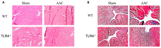 (A) H&E staining images (10×) and (B) Masson’s staining images (5×) of cardiomyocytes in TLR4−/− and WT controls in response to AAC.