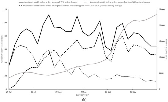 Figure 1b depicts the trends of weekly online orders with the weekly COVID-19 incidence. The number of WIC online orders increased to a peak in August, one month after online ordering was fully implemented in July 2020. Then the total online order numbers remained stable over time. Since the number of weeks in the study period is relatively small (26 weeks), no linear regression was conducted to examine the relationship between the number of weekly online orders and COVID-19 incidence. It is worth noting that the number of online orders among first-time users of online ordering reached a peak in the first month and then showed a waning trend over time. The number of weekly online orders among returning WIC online order patrons increased gradually over time until reaching a peak in October 2020, which indicates that online ordering was losing returning customers.