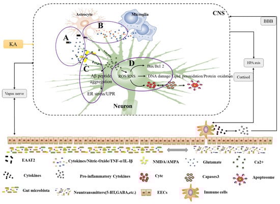 Pathogenesis of NDs under the microbe-gut-brain axis system. A. Excitotoxins. Glutamate is released from neurons and binds to receptors (NMDA, AMPA), along with glutamate uptake by excitatory amino acid transporter 2 (EAAT2) in astrocytes and the action of external factors (e.g., KA) all lead to increased glutamate excitotoxicity, thus promoting Ca2+ flow, endoplasmic reticulum stress, and pro-apoptotic signaling cascades. B. Neuroinflammation. Interactions between glial cells predispose to neuroinflammation, especially astrocytes and microglia. They may produce several cytokines and oxidants (e.g., TNF-α and IL-Iβ by astrocytes, nitric oxide, and pro-inflammatory cytokines by microglia) that bind to cell surface death receptors and activate pro-apoptotic signaling cascades. C. Endoplasmic reticulum stress. There are many causes of endoplasmic reticulum stress, mainly abnormal folding of Aβ peptides and activation of the unfolded protein response (UPR). This induces abnormal protein aggregation and increases intracellular calcium efflux, which triggers a pro-apoptotic signaling cascade. D. Oxidative stress and mitochondrial dysfunction. Oxidative stress causes excessive levels of reactive oxygen and reactive nitrogen in the mitochondria, exacerbating abnormal mitochondrial function. This ultimately leads to the release of apoptosis-inducing factors and the pro-apoptotic signaling protein cyt c, which then activates the caspase cascade or other apoptotic proteins to form apoptotic vesicles, ultimately leading to neuronal apoptosis. HPA: hypothalamic-pituitary-adrenal axis; intestinal endocrine cells; EECs: BBB: blood-brain barrier; CNS: central nervous system; ROS/RNS: reactive oxygen species reactive nitrogen species.