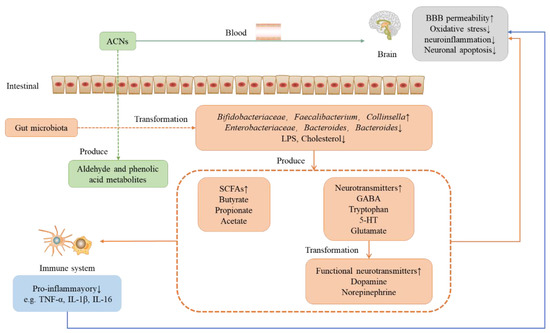 Accumulating evidence suggests that for NDs, partly because of oxidative stress and neuroinflammation, etc., neuroinflammatory processes are modulated by peripheral inflammation, particularly from the gut microbiota. There is evidence that NDS may have originated in the gut. In addition, changes in gut microbiota homeostasis are also closely related to the anti-inflammatory properties of anthocyanins. It regulates the gut microbiome through the microbial-gut-brain axis and acts as a preventive role in NDs. Under the microbial-gut-brain axis system, the effect of anthocyanins on the nervous system is shown in Figure 3.