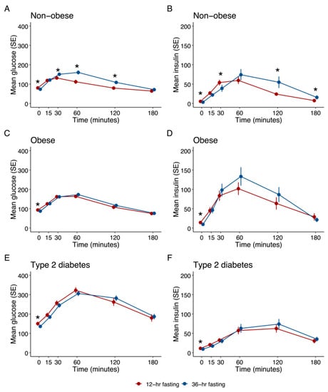 Effects of 12 h and 36 h fasting on glucose metabolism during OGTT (n = 20 in each cohort); * p < 0.05. (A) Effect on plasma glucose in non-obese cohort (B) Effect on serum insulin in non-obese cohort (C) Effect on plasma glucose in obese cohort (D) Effect on serum insulin in obese cohort (E) Effect on plasma glucose in type 2 diabetes cohort (F) Effect on serum insulin in type 2 diabetes cohort.