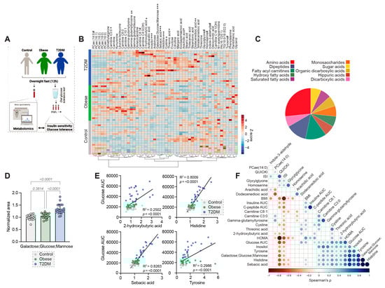 Differences in the 12 h metabolomes. (A) Schematic overview of the analysis approach. ((A) was created with BioRender.com) (B) Heatmap of the 50 top ANOVA-ranked metabolites. FDR-corrected p-values # < 0.1, * < 0.05, ** < 0.01, *** < 0.001. (C) Classification of significantly different metabolites. (D) Differences in the levels of Galactose; Glucose; Mannose, normalized to the mean of the non-obese cohort. (E) Simple linear regression analyses of selected metabolites and the glucose AUC during OGTT. (F) Spearman correlation matrix between significantly different metabolites and glycaemic parameters. The color and size of the dots correspond to the correlation coefficient. p-value cut-off 0.05.