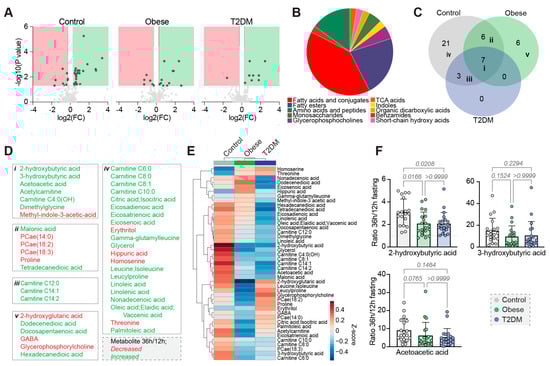 To identify fasting-responsive metabolites we looked for metabolites that significantly changed within each cohort (0.8 < FC > 1.2, FDR-corrected p-value <0.1) and identified 37, 19 and 10 metabolites in the non-obese, obese and type 2 diabetes cohort, respectively (Figure 3A and Figure S5), all belonging to classes known to be affected by fasting in mammals, including ketone bodies, fatty acids, polyunsaturated fatty acids, carnitines and amino acids (Figure 3B). Seven of these metabolites were shared across all three cohorts according to the selected thresholds (Figure 3C,D). The metabolic response to fasting appeared attenuated in obese and diabetic people (Figure 3E), including reduced increases of the ketone bodies and 2-hydroxybutyrate (n.s. and p < 0.05, respectively) (Figure 3F).
