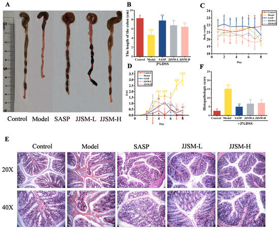 Six-week-old male specific pathogen-free (SPF) BABL/c mice (40) were purchased from the Animal Experiment Center of Hangzhou Medical University and randomly assigned to five groups (n = 8 in each group): blank control group (Control), model group (Model), positive control group (Salazosulfapyridine, SASP), JJSM low concentration group (JJSM-L) and JJSM high concentration group (JJSM-H). The mice were kept in sterile environments with a regulated temperature and humidity cycled every 12 h [13] under temperature-controlled and sterile conditions. Mice in the control group were given free access to sterile water, whereas mice in the other groups were given free access to 3% DSS solution (replaced every two days) for 8 days to develop acute experimental colitis. Groups were respectively given intragastric administration with normal saline, 200 mg/kg SASP [14,15], 500 mg/kg JJSM and 1000 mg/kg JJSM [16] for 8 days. The body weight, softness of feces and anal bleeding of the mice were recorded, and the drug intervention was observed after daily intragastric administration.