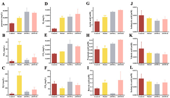 Gas production. (A) The pressure that remains after fermentation. Schizonepetae Spica results in increased pressure after incubation; (B) NH3; (C) H2S; (D) H2; (E) CO2; (F) CH4. The x-axis displays the sample groups, the y-axis displays gas amount, the gas abundance value is the mean of three biological replicates, and the error bars reflect the 95% confidence intervals. Short-chain fatty acid (SCFA) production. (G) Acetic acid; (H) Propionic acid; (I) Butyric acid; (J) Isobutyric acid; (K) Valeric acid; (L) Isovaleric acid. Data are presented as the mean ± S.D. # p < 0.05 vs. control, ## p < 0.01 vs. control, ### p < 0.001 vs. control, * p < 0.05 vs. model, *** p < 0.001 vs. model. M: molecular weight of gas.