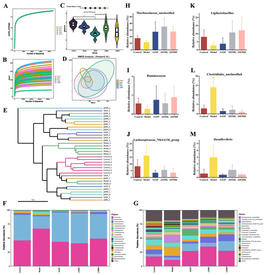 Analysis of microbial Alpha diversity. (A) Goods_coverage; (B) Chao 1 index and (C) Shannon index. Beta diversity: (D) Weighted NMDS analysis and (E) Weighted cluster tree analysis. Microbial community structure of each group: (F) Distribution of microbiome at phylum; (G) Distribution of microbiome at genus; (H) Relative abundance of Muribaculaceae_unclassified; (I) Relative abundance of Ligilactobacillus; (J) Relative abundance of Ruminococcus; (K) Relative abundance of Clostridiales_unclassified; (L) Relative abundance of Lachnospiraceae_NK4A136_group; (M) Relative abundance of Desulfovibrio. Data are presented as the mean ± S.D. ## p < 0.01 vs. control, * p < 0.05 vs. model, ** p < 0.01 vs. model, *** p < 0.001 vs. model.