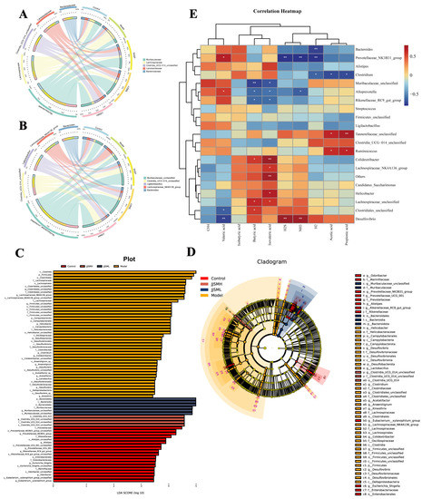 Circos diagram of species-sample relationships (top 5 bacteria). (A) At family level; (B) At genus level. LDA Effect Size (LEfSe): (C) Histogram of linear discriminant analysis (LDA) value distribution. LDA score ≥ 3.5. The length of the bar chart represents the size of the impact of significantly different species. (D) Cladogram. Each node’s size reflects the species’ relative abundance. (phylum = p; class = c; order = o; family = f; genus = g; species = s). (E) Microbiota and index correlation clustering heat map. Rows indicate species, and columns indicate gas and SCFAs relevant to this study. * p < 0.05, ** p < 0.01. Red indicates a positive correlation, blue indicates a negative correlation. The darker the color, the stronger the correlation.