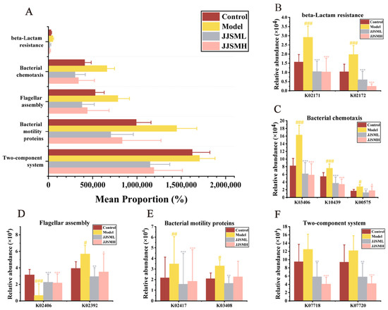 Function prediction. (A) Level 3 KEGG pathway alterations. KOentries with dominant abundance and significant differences in the pathway. (B) Beta-Lactam resistance; (C) Bacterial chemotaxis; (D) Flagellar assembly; (E) Bacterial motility proteins; (F) Two-component system. # p < 0.05 vs. control, ## p < 0.01 vs. control, ### p < 0.001 vs. control, * p < 0.05 vs. model, ** p < 0.01 vs. model, *** p < 0.001 vs. model.