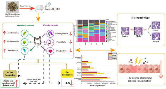 The outcomes of this research suggested that gas-mediated intestinal microbiome regulation prompted the JJSM to relieve DSS-induced colitis (Figure 6).