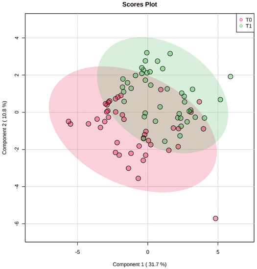 The PLSDA is shown in Figure 1, while the PCA is reported in Supplementary Figure S1. The cross-validation and the permutation test of PLSDA are reported in Supplementary Figures S2 and S3, respectively. Overall, the PLSDA model was robust (p-value of permutation test equal to 5 × 10−4), giving a visual representation of the difference between data obtained at T0 and T1.