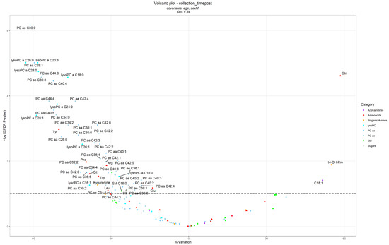 The results of the linear models assessing the differences in metabolite concentrations before and after the treatment, correcting per age and sex, are summarized in the volcano plot reported in Figure 2, while the complete results are described in Supplementary Table S3.