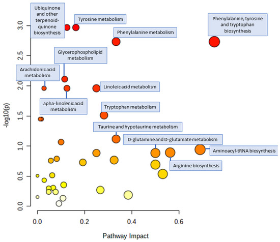 The results of the pathway analysis are reported in Figure 3 and in Supplementary Table S30. The BWRT has the highest impact on the phenylalanine, tyrosine, and tryptophan biosynthesis. Other pathways highly impacted were the aminoacyl-tRNA biosynthesis, the arginine biosynthesis, and the glutamine and glutamate metabolisms, while other pathways with a high significance were the terpenoid-quinone biosynthesis, the glycerophospholipid, the arachidonic acid, the linolenic acid, and the tryptophan metabolisms.
