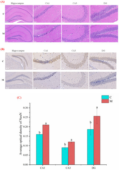Effect of MFGM on hippocampal neurons in mice: (A) H and E; (B) Nissl staining of the mice’s hippocampus, dentate gyrus (DG), CA1 and CA3 region. Scale bars = 50 μm in CA1, CA3, and DG; Scale bars = 200 μm in hippocampus; and (C) The average optical density (AOD) of NeuN (neuronal nuclei) in the CA1, CA3, and DG region. All experiments were in triplicate. Different lowercase letters (a, b) in (C) means significant statistical differences. Capital letters “C” and “M” in (A,B) represent control and experimental groups, respectively. Data are presented as mean ± SEM, p < 0.05 compared to the control group.