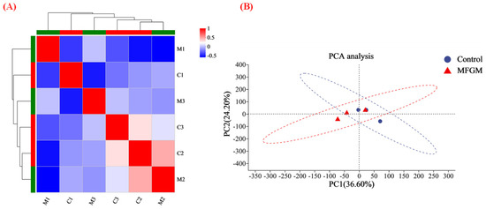 Functional annotation of whole proteins: (A) heat map of the correlation between M and C (C1, C2, C3 and M1, M2, M3 represent parallel samples of the control and experimental groups, respectively); and (B) PCA analysis. “MFGM” in (B) represent experimental groups.