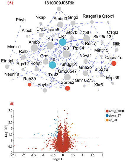 Pearson correlation analysis and PCA were employed to analyze the similarity of whole proteins in groups C and M according to the types and contents of proteins in the two groups. The closer the Pearson correlation was to 1, the higher the similarity of protein composition between groups C and M [30]. In addition, 47 differentially expressed proteins (DEPs), including 20 upregulated and 27 downregulated proteins were identified. It cannot be ignored that phospholipids not only have a positive effect on behavior, but also participate in the upregulation of genes such as neurodevelopment in the hippocampus [31]. The most upregulated proteins were associated with memory and cognition [32,33,34,35]. Rab proteins are a vesicle transporter regulatory group. They are located in different membrane structures and regulate vesicle transport, affecting neuromodulation and cognitive ability by affecting the formation of synapses [36]. Deletion of Rab39b resulted in impairments of synaptic structures and functions, with reductions in NMDA receptors in the postsynaptic density [32]. NMDA receptors, ionotropic glutamate receptor, is central to memory consolidation and spatial processing in the hippocampus [37]. Thus, upregulated expression of Rab 39 may promote synaptic structure formation and increased function to improve memory and cognitive performance in mice. Furthermore, in a previous study, the deletion of Sorbs2 in mice reduced dendritic complexity and excitatory synaptic transmission in DG granule cells and impaired acoustic startle response and long-term memory. The Cacna1e gene encodes CaV2.3 channels, which are widely expressed throughout the nervous system and are located in presynaptic terminals, dendritic spines, and some extrasynaptic sites. Disruption of CaV2.3 channel function leads to increased anxiety-like behavior and impaired spatial memory [38]. On the other hand, the top two proteins in the interaction network according to the degree of protein interaction were Hp and lrg1 (Figure 4A), the two most downregulated proteins. Multiple studies have shown that the expression of these two proteins leads to higher cognitive impairment [39,40]. The findings of Guerrero-Berroa et al. suggest that patients with type 2 diabetes and poor glycemic control carrying the Hp 1-1 genotype may be at increased risk of cognitive impairment, particularly in the attention/working memory domain [39]. Also, compelling evidence indicates that Lrg1 can promote apoptosis and autophagy to exacerbate ischemia/reperfusion-induced brain injury through the transforming growth factor beta (TGFβ)/SMAD signaling pathway [41]. In another study, Akiba et al. indicated that Lrg overexpression in the hippocampus can lead to synaptic dysfunction and to memory impairment with age [42].