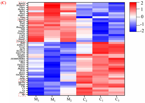 (A) Interaction map of differential expression proteins; (B) volcano plot of the differentially expressed protein in the M group compared to the C group; and (C) the differentially expressed protein expression heatmap. The blue represents the lower expression level. The white represents the median value, and the red refers to the higher expression level. (C1, C2, C3 and M1, M2, M3 represent parallel samples of the control and experimental groups, respectively). Genes in red dashed boxes in C are strongly correlated with memory and cognitive ability.