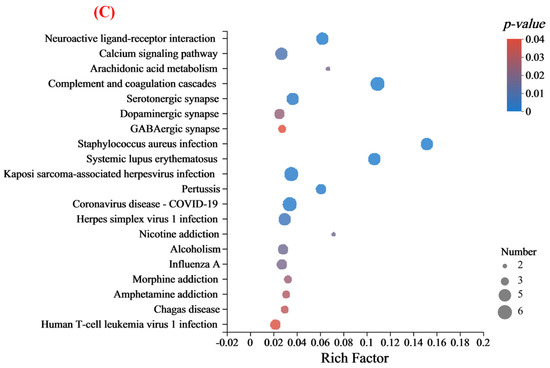 To better understand the functions and characteristics of the DEPs identified in this study, GO analysis was used to reveal the top GO terms. As shown in Figure 5A, the proteins with different expression proteins were classified into three sub-components: biological processes, molecular functions, and cellular components. In the biological process category, most DEPs were involved in the cellular process, biological regulation, metabolic process, and response to the stimulus. The cellular component category indicated that over half of the identified proteins were located in the cellular anatomical entity. For the molecular function part, many proteins identified were associated with binding and catalytic activity. Of course, the subcellular localization and classification of altered proteins indicated that the cytoplasmic, nuclear, and extracellular accounted for 70% of the above (Figure 5B). Furthermore, KEGG pathway analysis was performed to identify the associated signaling pathways. It mainly included neuroactive ligand-receptor interaction, calcium signaling pathway, complement and coagulation cascades, serotonergic synapse, and dopaminergic synapse (Figure 5C). Meanwhile, KEGG enrichment analysis of the DEPs identified a total of 202 pathways, with only 7 signaling pathways significantly enriched (p < 0.05), which might be associated with improved learning memory capacity in group M (Table 2).