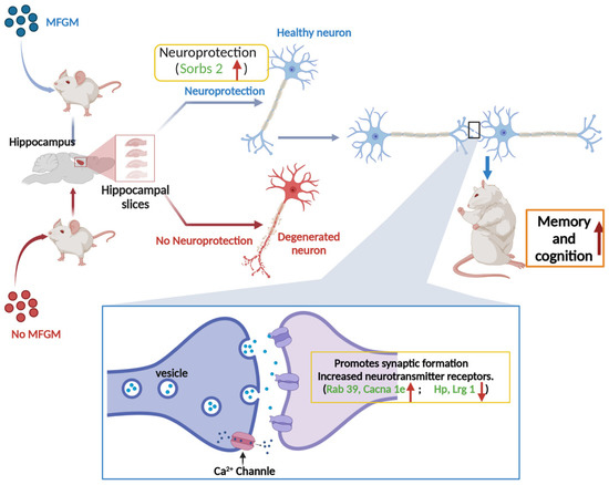 KEGG pathway analysis was performed to identify the associated signaling pathways to understand better the functions and characteristics of the DEPs identified in this study. It has been shown that the disruption of genes involved in “neuroactive ligand-receptor interactions” leads to decreased memory function [43]. The results of Qiu et al. revealed a close link between behavioral changes and altered neurotransmitter receptor gene expression in Benzo(a)pyrene-treated rats [44]. Also, the calcium pathway regulates memory formation in neurons [45]. As observed in Table 2, “neuroactive ligand-receptor interactions” are one of the signaling pathways involved. It is positively correlated with memory and cognitive performance [46]. The possible mechanism of MFGM intervention to enhance mice’s cognitive and memory abilities is shown in Figure 6. In detail, the upregulation of Sorbs 2 may have a certain protective effect on neuronal cells, thereby delaying the natural apoptotic cycle of neuronal cells. Also, the upregulation of Rab 39 and Cacna 1e promotes the formation of synaptic structures, the increase of neurotransmitter receptors, and the smoothness of calcium channels. The downregulation of Hp and Lrg 1, two genes that inhibit synaptic conduction and neuromodulation, also promotes memory and cognition from another perspective.