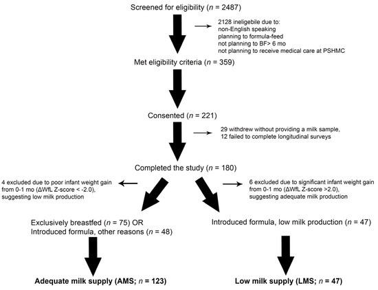 CONSORT Diagram. Research staff screened 2487 mother–infant dyads, approached 359 eligible dyads, and obtained consent from 221 dyads. There were 180 mothers that provided at least one milk sample and completed sufficient longitudinal surveys to determine whether they experienced low milk supply (LMS) or adequate milk supply (AMS). There were 4 or 6 mothers excluded from each group for excessive infant weight gain or weight loss (defined as a change in weight-for-length (WfL) Z-score > 2.0), which suggested milk production may have been over- or under-estimated. This left 47 mothers with LMS, and 123 mothers with AMS. Of the 123 mothers with AMS, 48 introduced formula into their infant’s diet prior to 12 months for reasons other than concerns about milk supply.
