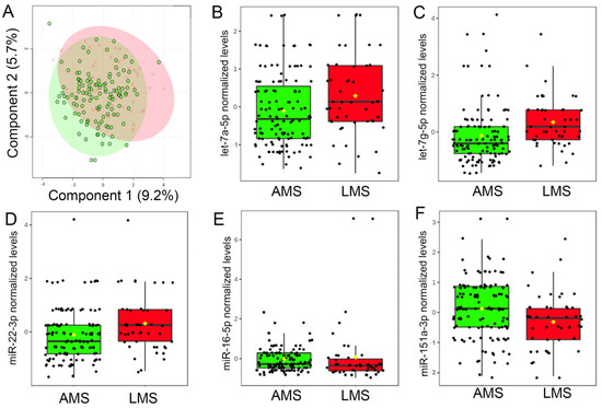 Levels of miRNAs in breast milk differ among women with low milk supply. (A) Results of a two-dimensional partial least squares discriminant analysis (PLSDA) employing levels of 30 miRNAs with the most robust concentrations in maternal breast milk in the first week after delivery. Note that total milk miRNA profiles do not differ between mothers with adequate milk supply (AMS; green) and mothers with low milk supply (LMS; red). However, milk levels of five miRNAs did differ in the milk of mothers with LMS. In the first week after delivery, levels of (B) let-7a-5p (V = 2194, p = 0.015, adj p = 0.090), (C) let-7g-5p (V = 1765, p = 8.5 × 10−5, adj p = 0.0025), and (D) miR-22-3p (V = 2135, p = 0.0080, adj p = 0.080) were higher in the milk of mothers with LMS, whereas levels of (E) miR-16-5p (V = 0.3595, p = 0.013 adj p = 0.090) and (F) miR-151a-3p (V = 3670, p = 0.0063, adj p = 0.080) were lower.