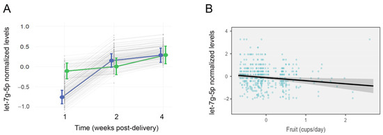 Milk levels of let-7g-5p differ over time among mothers with low milk supply and are related to maternal fruit intake. The effects plot displays normalized concentrations of let-7g-5p in 453 samples from 170 lactating mothers across three time points: 1 wk, 4 wks, and 16 wks after delivery (A). Mean concentrations are shown for mothers with low milk supply (LMS, green), and mothers with adequate milk supply (AMS, blue). There was a significant interaction effect (p < 0.001) between LMS/AMS group and time (F = 7.5), with let-7g-5p levels increasing between 1 wk and 4 wks post-delivery in the AMS group only. (B) A second mixed effects model also revealed a significant effect of maternal fruit consumption on milk levels of let-7g-5p (F = 5.99, p = 0.015). Higher levels of let-7g-5p were associated with lower fruit consumption, as reported longitudinally on the Dietary Screener Questionnaire.