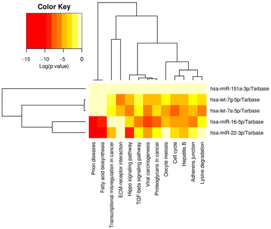 The messenger RNA targets of the five miRNAs of interest (miR-22-3p, miR-16-5p, let-7a-5p, let-7g-5p, miR-151a-3p) were interrogated in DIANA miRPATH using the Tarbase algorithm. The five miRNAs targeted 13 physiologic pathways with greater frequency than would be expected by chance alone, including cell cycle, fatty acid biosynthesis, adherens junctions, Hippo signaling, TGFβ signaling, and ECM-receptor interaction (Table 3).