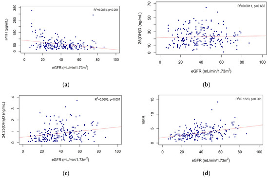 A negative correlation was found between iPTH level and eGFR (R2 = 0.0874, p < 0.001) (Figure 1a). The 25(OH)D level showed no significant correlation with the eGFR (R2 = 0.0011, p = 0.632) (Figure 1b). There was a positive correlation between the eGFR and the 24,25(OH)2D level (R2 = 0.0603, p < 0.001). The eGFR and VMR were also positively correlated (R2 = 0.1523, p < 0.001) (Figure 1c,d).
