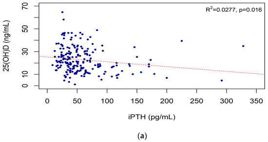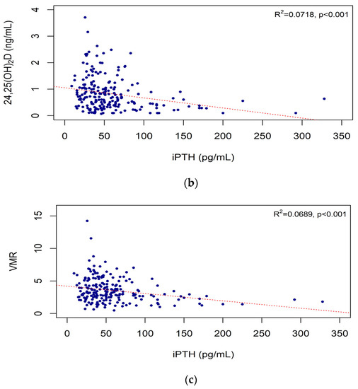 The iPTH level was negatively correlated with the 25(OH)D (R2 = 0.0277, p = 0.016) (Figure 2a), 24,25(OH)2D (R2 = 0.0718, p < 0.001) (Figure 2b), and VMR (R2 = 0.0689, p < 0.001) (Figure 2c) levels. The serum phosphate level was negatively correlated with the eGFR. The serum calcium, phosphate, and Ca × P levels were not correlated with the iPTH level or vitamin D biomarkers (Table A1).